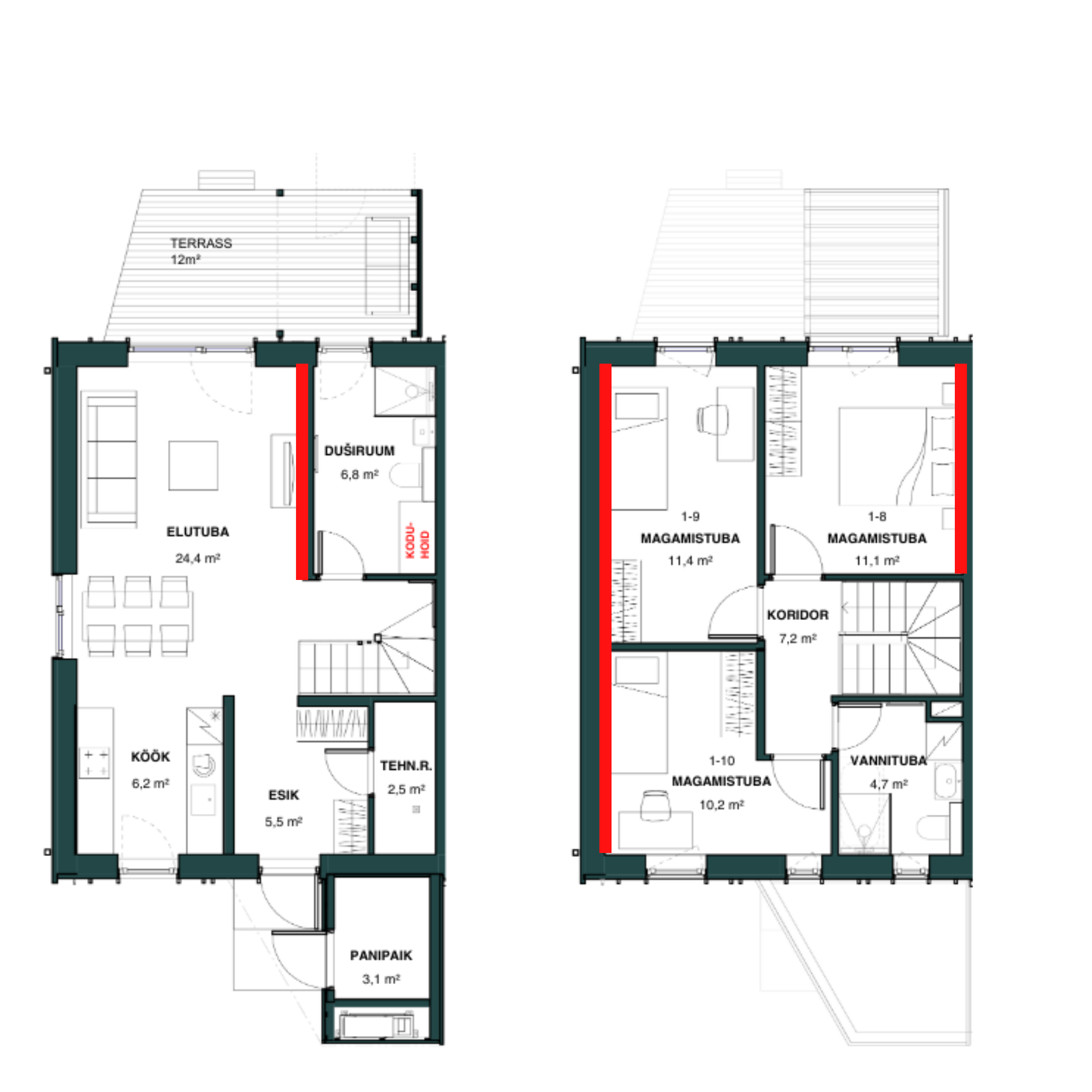 Läbi kahe korruse kulgev kodu mahutab kolm magamistuba ja kaks duširuumi. Ülakorruse pesuruumi saab soovi korral paigaldada ka vanni. Praktiline panipaik maja ees lahendab hooajaliste ja muude asjade hoiustamise.