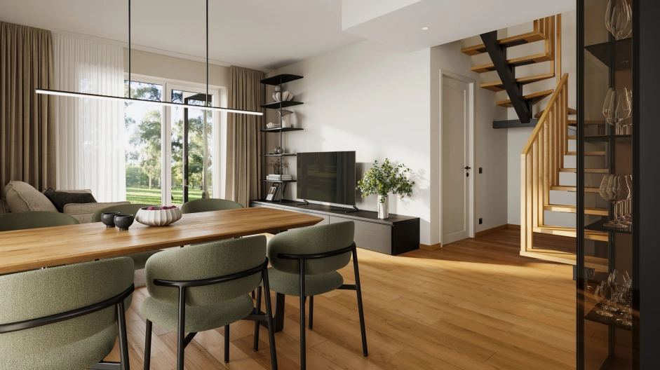 Selle neljatoalise kodu südameks on avar elutuba, kust avaneb otsepääs õhtupäikesele avatud terrassile ja hoovi. Köök on elutoaga ühendatud, kuid asub eraldi tsoonis – nii on ühine ajaviide perega ja köögitoimetused omavahel ühendatud, kuid siiski parajalt eraldatud.